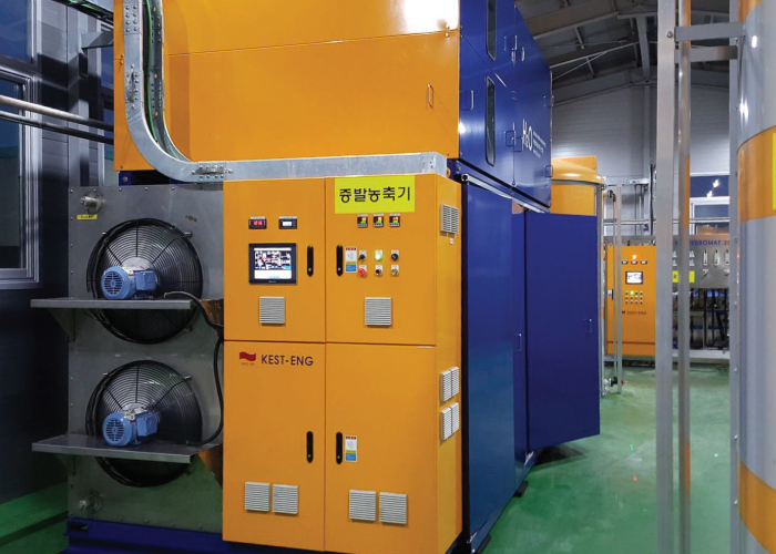 산업체 생산공정에서 발생된, 오염된 폐수를 증발농축처리하여 외부로 방류하지 않고 생산공정에 재사용하는 시스템.