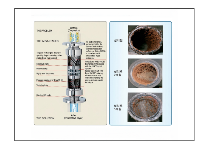 - 이때 AQUABION를 통과하면서 만들어진 110 um인 구상구조의 스케일 입자가 배관내벽의 스케일을 끊임없이 두드려서 서서히 스케일을 제거해나간다.
